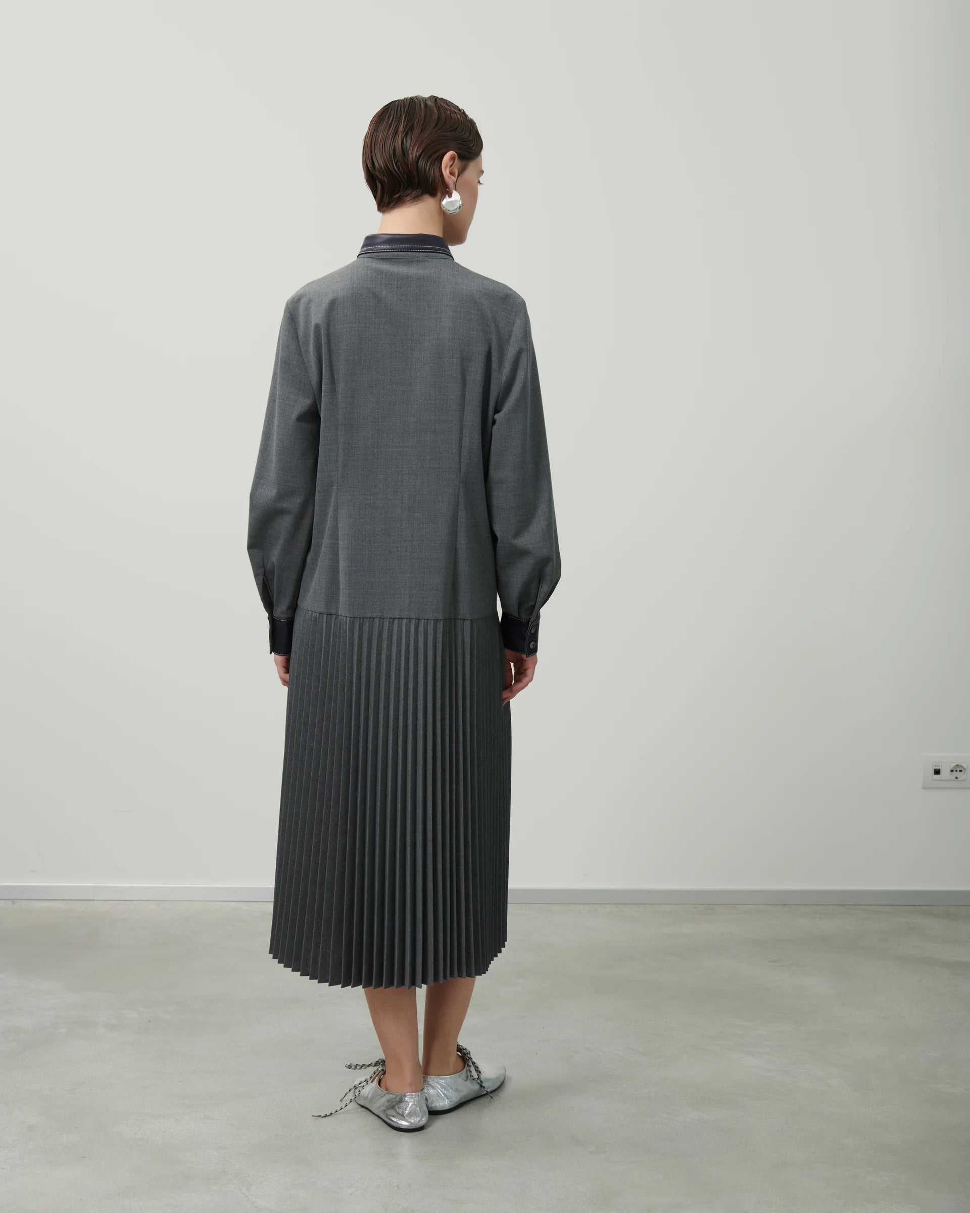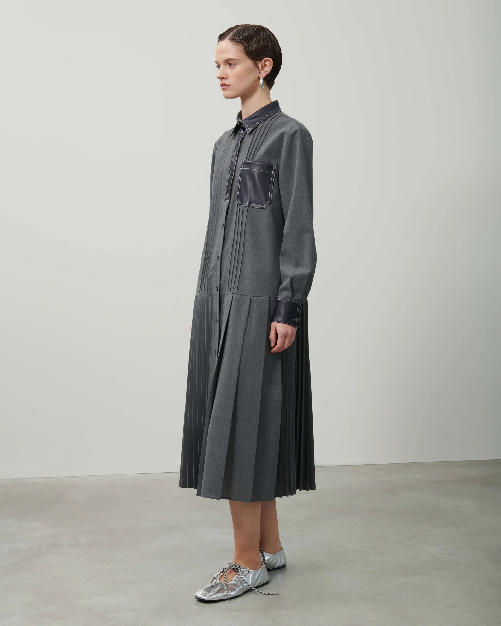 Realizzato in tela di misto viscosa, questo abito presenta una gonna a pieghe che combina perfettamente pieghe piatte svasate e pieghe a sole. È caratterizzato da un tradizionale colletto a camicia in ecopelle, maniche lunghe con polsini bassi alle estremità e pieghe cucite sul davanti. La tasca in ecopelle e la cintura in vita completano il design. Lunghezza midi. Prodotto in Italia.
