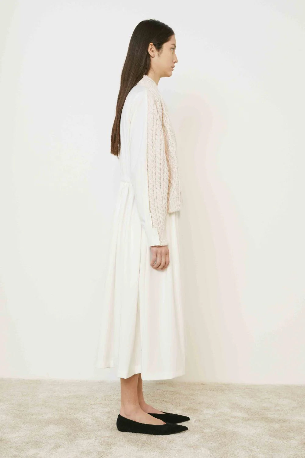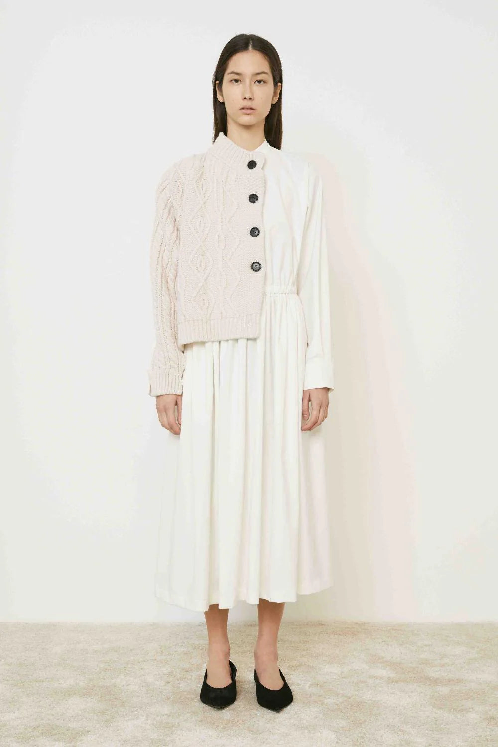 Abito Angora MeimeijABITO LUNGO CON INSERTO DI MAGLIERIA SUL DAVANTI.ALLACCIATURA FRONTALE CON BOTTONI,COLLETTO ALLA COREANA E MANICA LUNGA CON POLSINI.